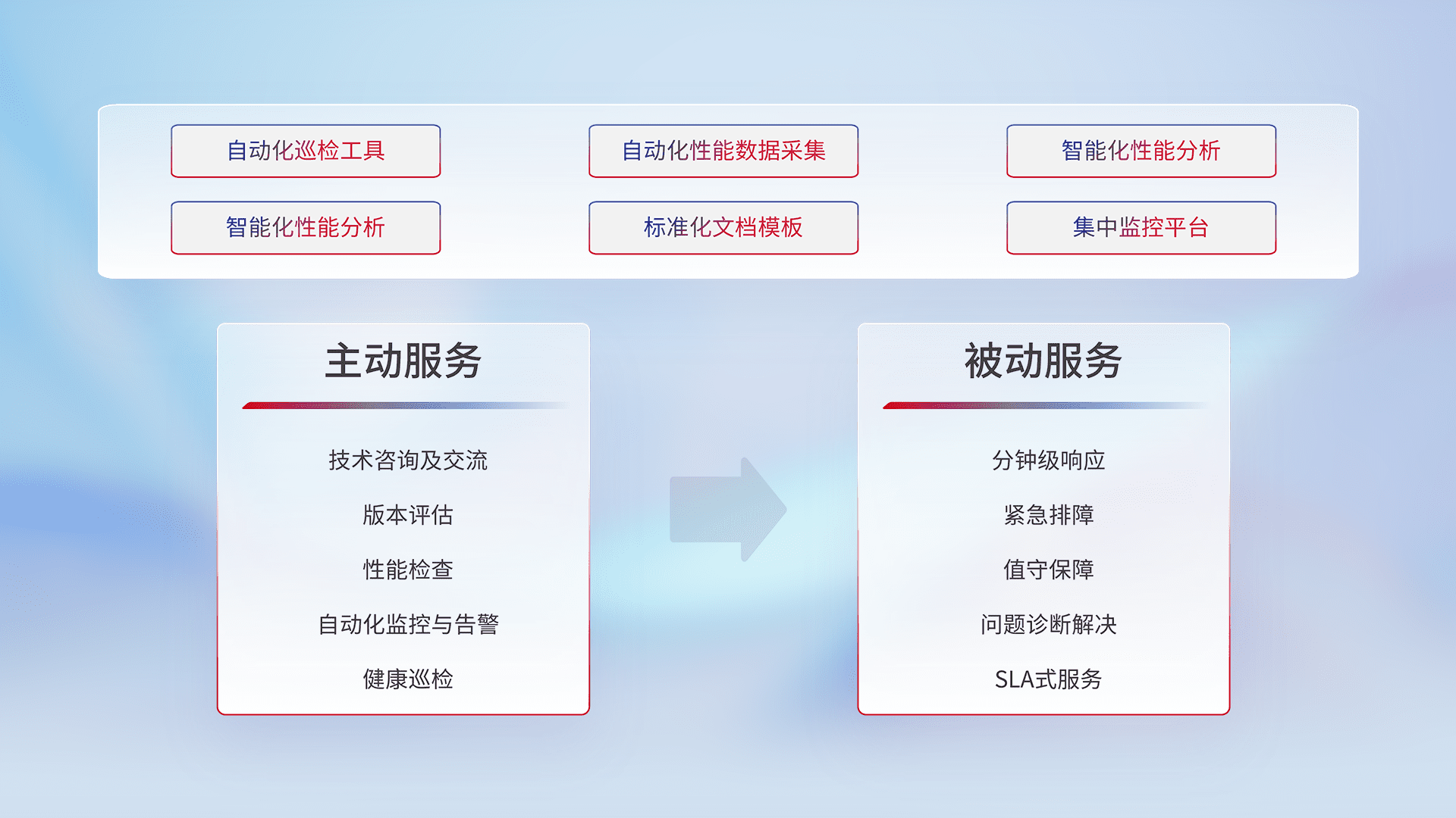 智能化工具和标准化文档,,,,保障服务质量,,,,提供主动服务(包含技术咨询、、、、版本评估、、、性能检查、、、自动化监控与告警、、健康巡检)和被动服务包含(分钟级响应、、、、紧急排障、、、值守保障、、问题诊断解决、、、SLA服务)。。。