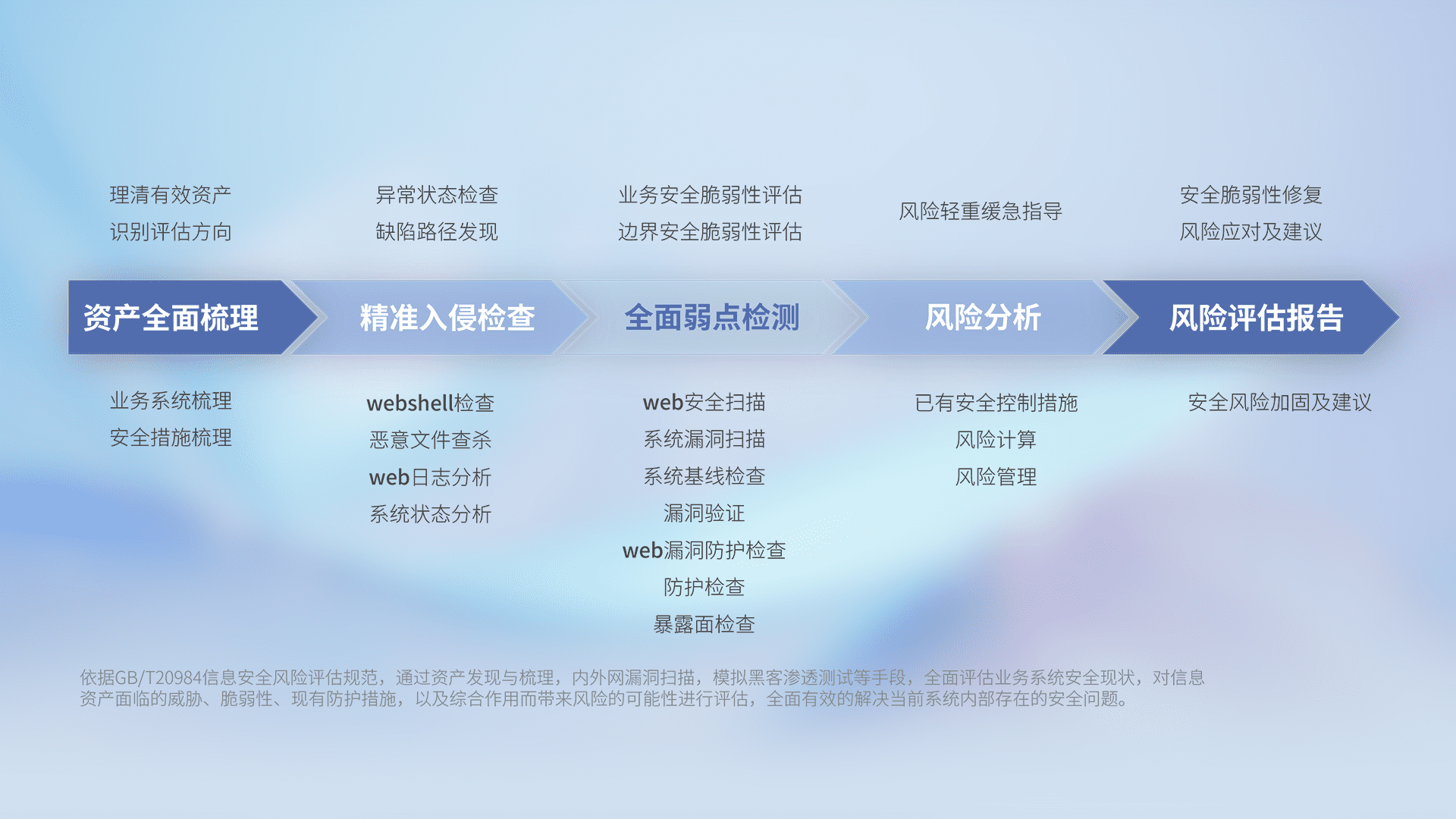 针对客户行业特性,,,以专业的安全服务+多厂商联合解决方案提供专属的一站式安全管理服务,,帮助客户全面感知网络空间威胁,,,基于识别、、、、检测、、、分析、、、、防护、、监测、、、响应的服务理论模型,,,从方案咨询、、、集成交付、、评估验证、、、优化加固、、、、运维运营,,致力于为客户提供完整的闭环管理式安全服务。。。以实战经验为客户打造高抵御风险的安全体系,,帮助客户发现威胁、、对抗威胁、、处置威胁,,,不断积累安全对抗能力,,,,持续保障数字化安全。。。