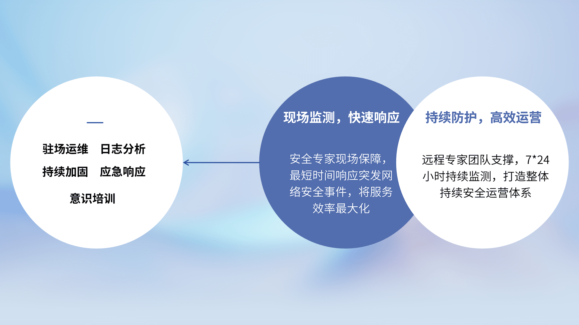 针对客户行业特性,,,,提供专属的一站式安全管理服务,,,,帮助客户全面感知网络空间威胁,,,通过安全专家的线上、、、线下防护支持,,,,实现风险闭环,,,,将安全保障常态化,,为客户打造常态化安全运维运营服务。。